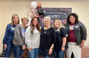 Kelly, third from right, celebrates her retirement with her “work family,” Meghan Hall, Kristie Nolan, Ashley Creech, Makeshia Harvey and Cindy Smith.