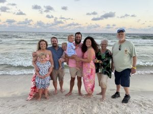 Kelly, second from right, with her daughter Ashley, son-in-law Guy, granddaughters Sophie and Phoebe; daughter Kaitlyn, son-in-law Josh, grandson Miles and husband Bud.